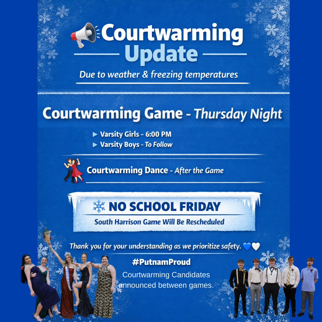 Due to impending weather and freezing temperatures expected on Friday, all Courtwarming festivities have been moved to Thursday to help keep our students, staff, and community safe.